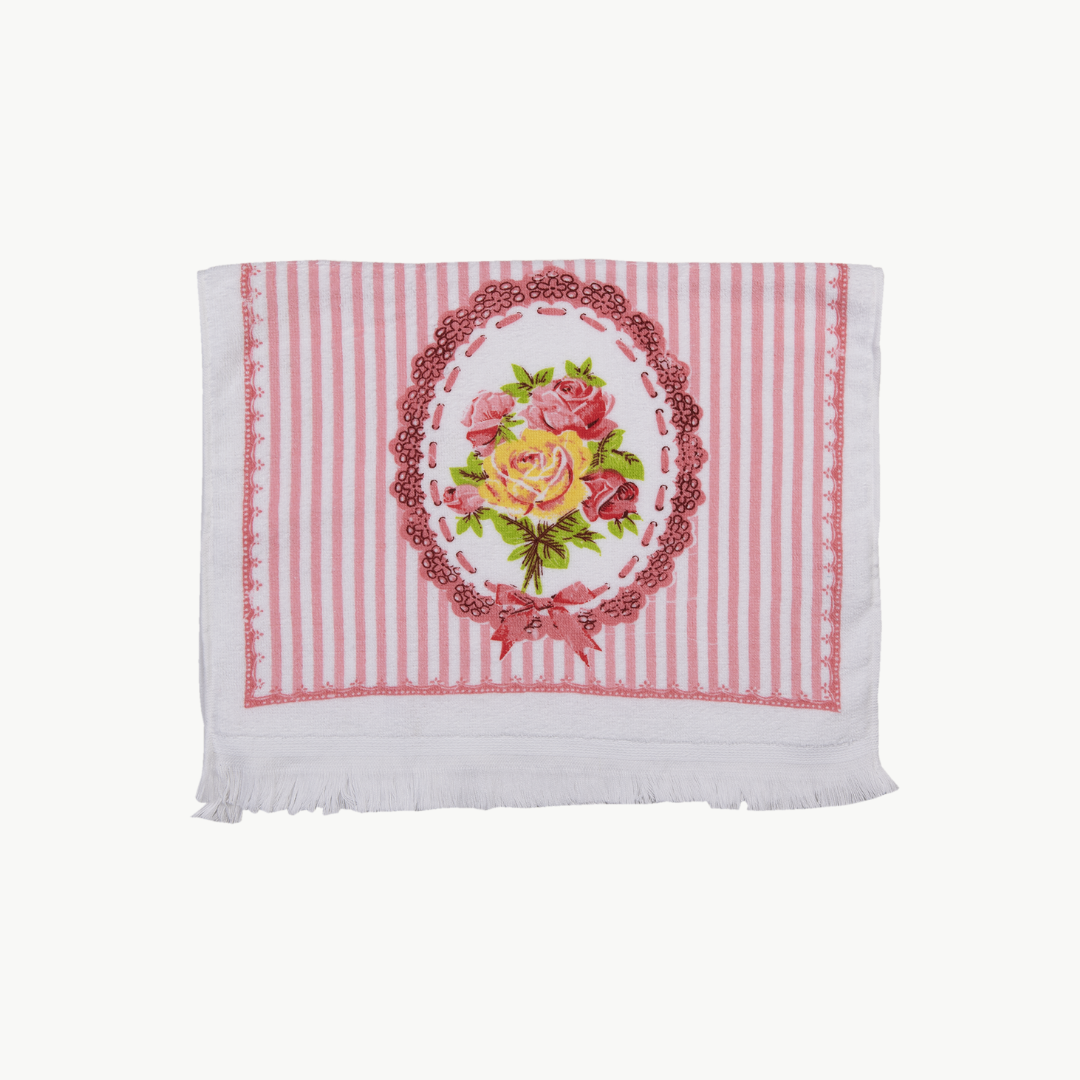 Ein romantisches Gästehandtuch mit Charme: Mit einem wunderschönen Rosenbukett im schönen rosa-weißen Look ist dieses Handtuch ein echter Hingucker! Es besteht aus 100 % Baumwolle und hat einen Fransenrand.