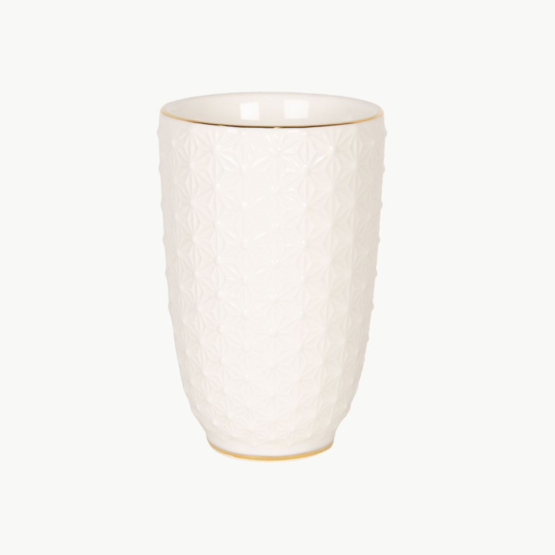 Der edle Zahnputzbecher in weiß-goldfarbenem Design mit zartem Blumenmuster ist ein stilvolles Accessoire für jede Landhaus- oder Vintage-Badezimmerdekoration. Mit einem Durchmesser von 7 cm und einer Höhe von 12 cm ist er nicht nur praktisch, sondern auch ein echter Blickfang.